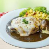 Parmigiana Chicken served with Brown Sauce, Sweet Corn & Mashed Potato