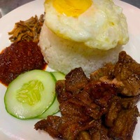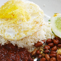 Nasi Lemak served with Lamb Grill, Sunny Egg, Vege, Anchovies & Nuts.