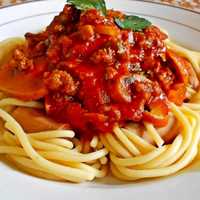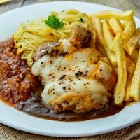 Spaghetti served with Parmigiana Chicken, Chips, Bolognaise Sauce & Brown Sauce